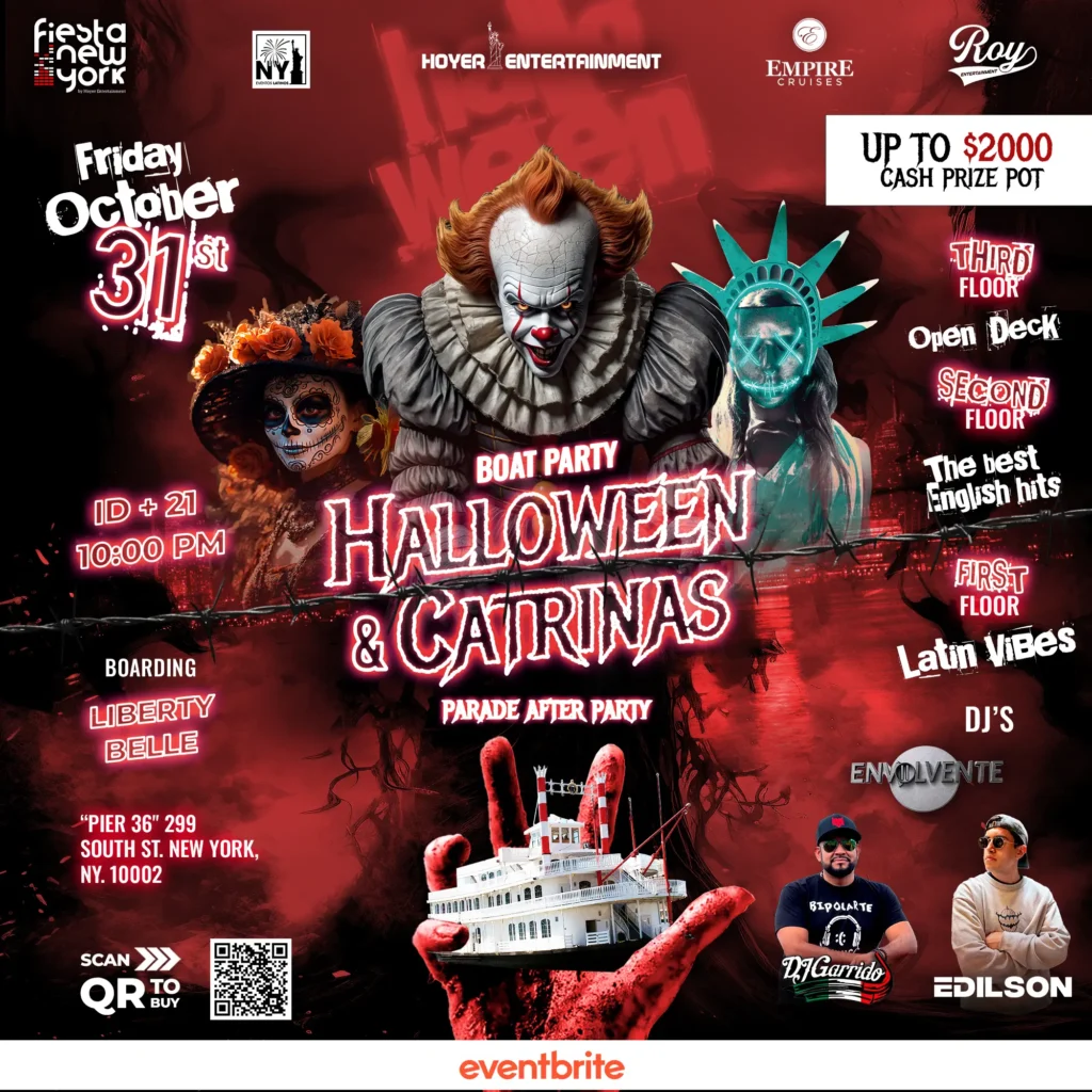 Experience the scariest and most elegant night in New York at our Halloween & Catrinas Boat Party this October 31st. Get ready for a unique experience with $2,000 in prizes, live DJ music, and the best atmosphere. Parade After Party. Boarding begins at 10:00 PM, 21+ with ID required. Don’t miss the boat party that will haunt your nightmares.